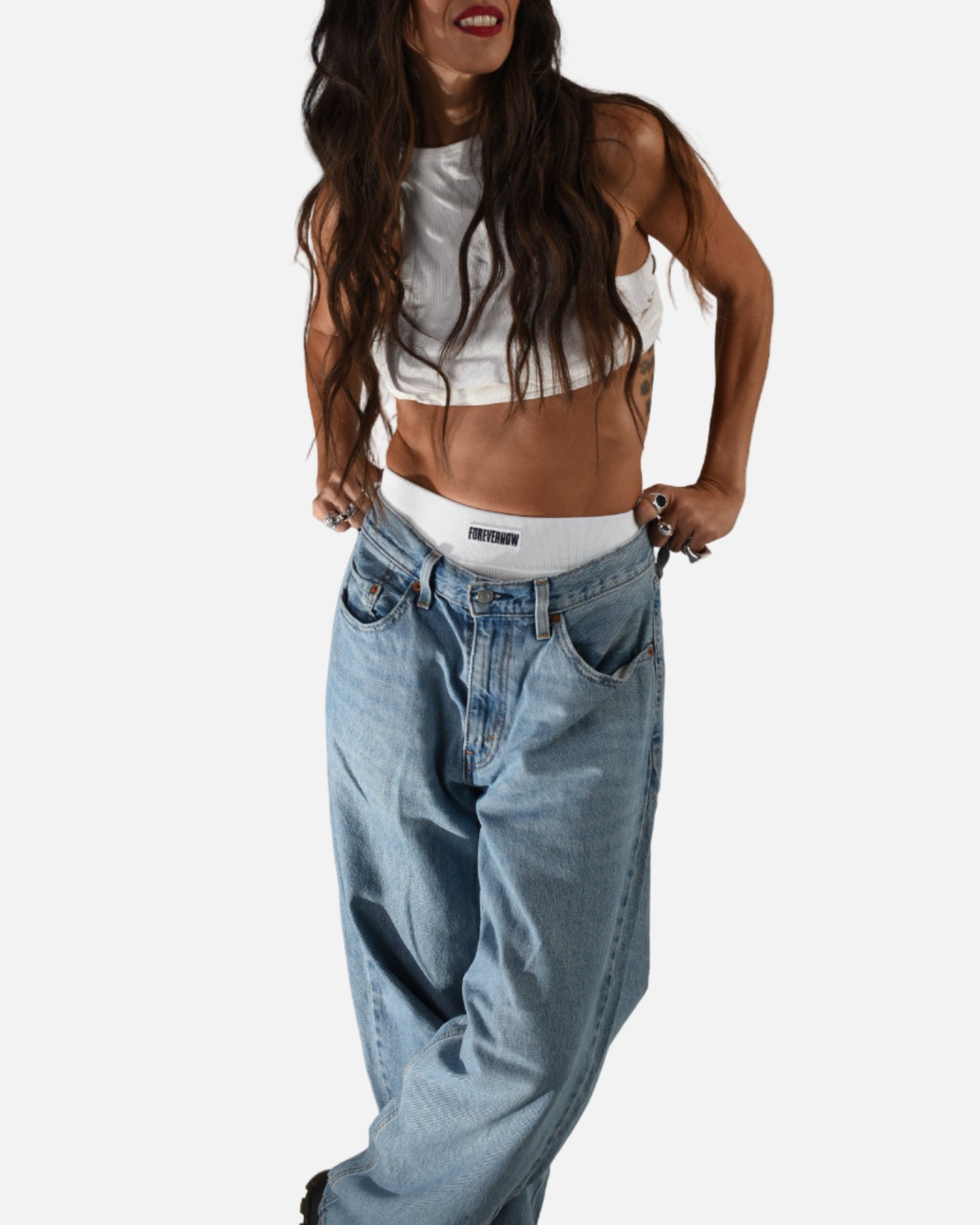 - Embroidered FOREVERNOW detail in red or blue.